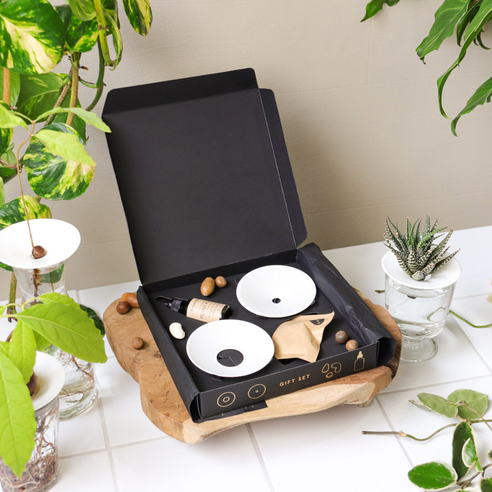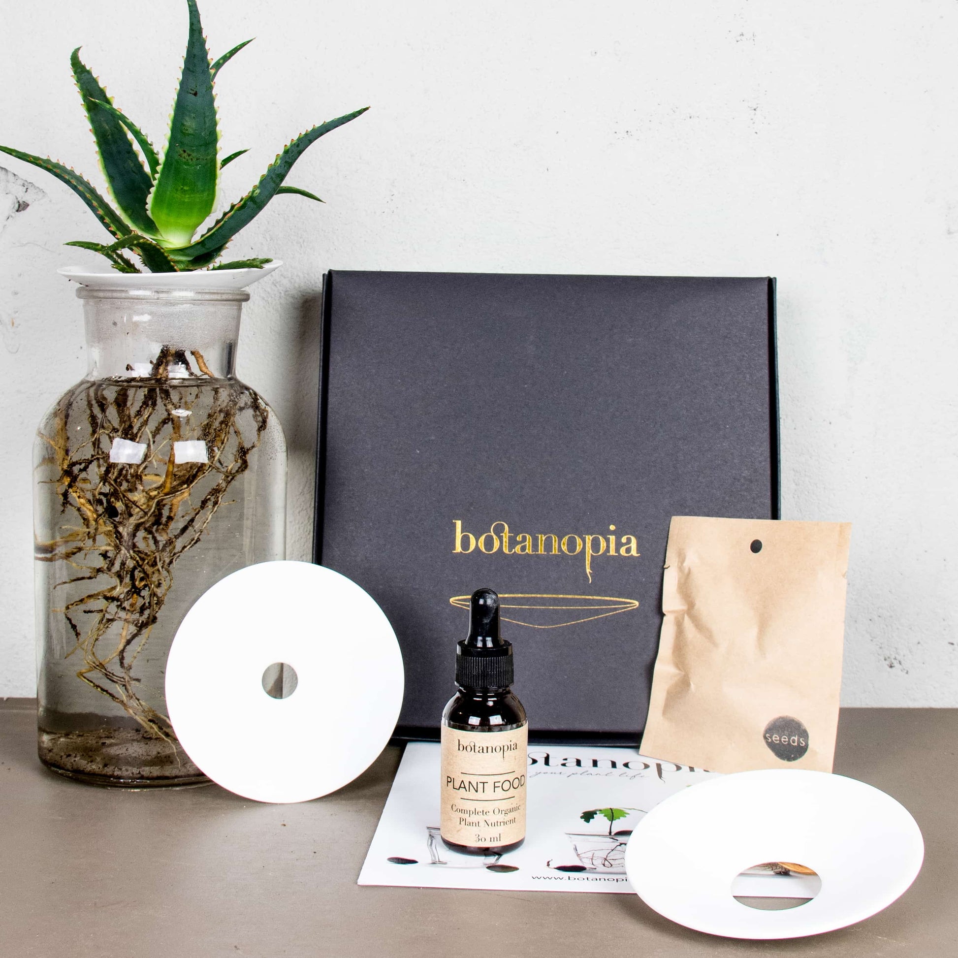 Talířky jsou originální design Botanopia, vyrobené z bílého porcelánu ručně v EU. Položíte je na sklenici nebo vázu s vodou, na otvor nahoru dáte semeno nebo řízek – a jen sledujete, jak se pod hladinou tvoří nové kořínky. Organické hnojivo zajistí, že se rostlinám ve vodě bude dlouhodobě dařit.